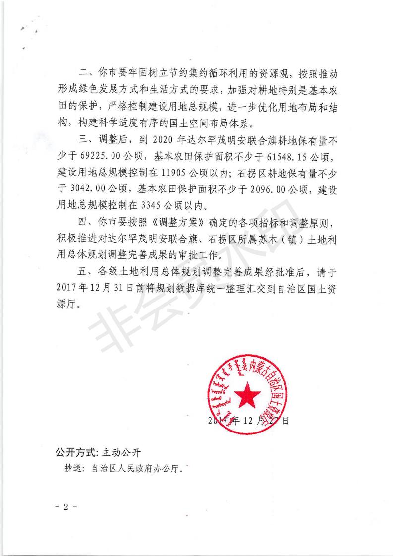 关于同意包头市达茂石拐区及政府所在地镇土地利用总体规划(2009-2020)调整方案的批复